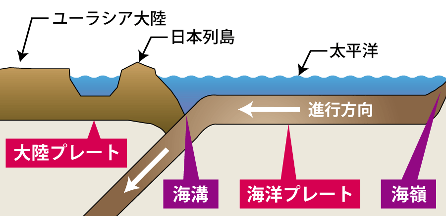 さらに次のイラストで、海溝・トラフとプレートの関係を見てみましょう。