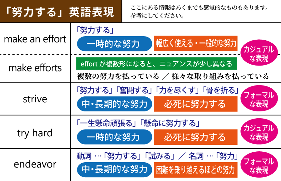 ・動詞では「努力する」「試みる」、名詞では「努力」という意味があります。
