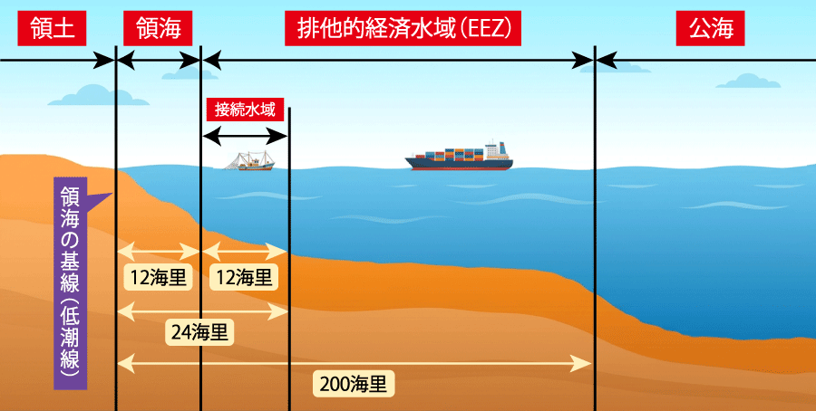 この記事では、「領海」と、その外側にある「排他的経済水域」や「接続水域」、さらにその外側にある「公海」について解説します。